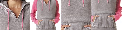 7 oz. 55% cotton, 45% polyester burnout fabric; Acid-washed with silicone finish; Cut "v" neckline; Contrast sleeves; Hood and waistband;