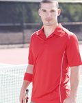 5 oz./yd2 / 172 gsm, 100% polyester face plaited to 60% polyester, 40% cotton back (total overall garment 61% polyester, 39% cotton); Proprietary dual-sided mesh pique knit constructed of fine denier wicking polyester on the outside and soft-as-cotton wicking blend on the inside; Moisture-wicking performance with UV 15-39 protection; Three-button placket; Dyed-to-match buttons; Matching flat-knit collar with contrast double tipping; Hi-low hemline; Side vents; Active fit; Easy care;
