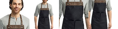 6 oz., 65% polyester, 35% cotton twill; 100% polyurethane trim; Faux leather trim with 2 large eyelets ; Adjustable neckband with press studs; Two bellow-style pockets: 6.5"l x 10"w; 32" L x 28" W;