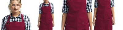9.4 oz., 100% heavy cotton canvas; Pouch style pocket stitched into four handy compartments ; Large metal eyelet detail for adjustable neckband knot ; Riveted pocket detail ; Metal eyelets secure 35" self fabric waist ties ; 34" L x 28" W;