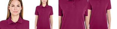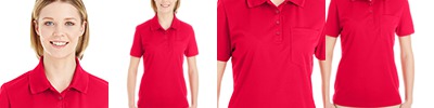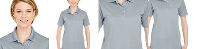 4.1 oz/yd / 139 gsm, 100% polyester piqu with moisure-wicking, anti-microbial and UV protection performance; Matching flat knit collar; Four-button narrow placket for feminine look; Side slits;